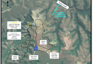 The open pit design includes 14,344 kt of Proven and Probable Mineral Reserves at a grade of 1.62 g/t Au. To access these reserves, 112.5 Mt of waste rock must be mined resulting in a stripping ratio of 7.8 to 1.