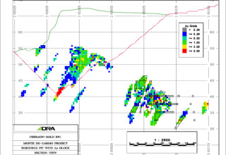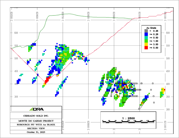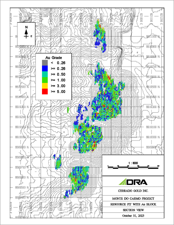 A plan map of the immediate Serra Alta deposit area (shown below) depicts the grade distribution at surface of the estimated Mineral Resources with respect to the optimized pit shell.