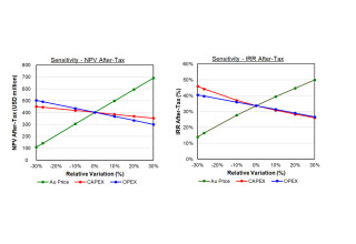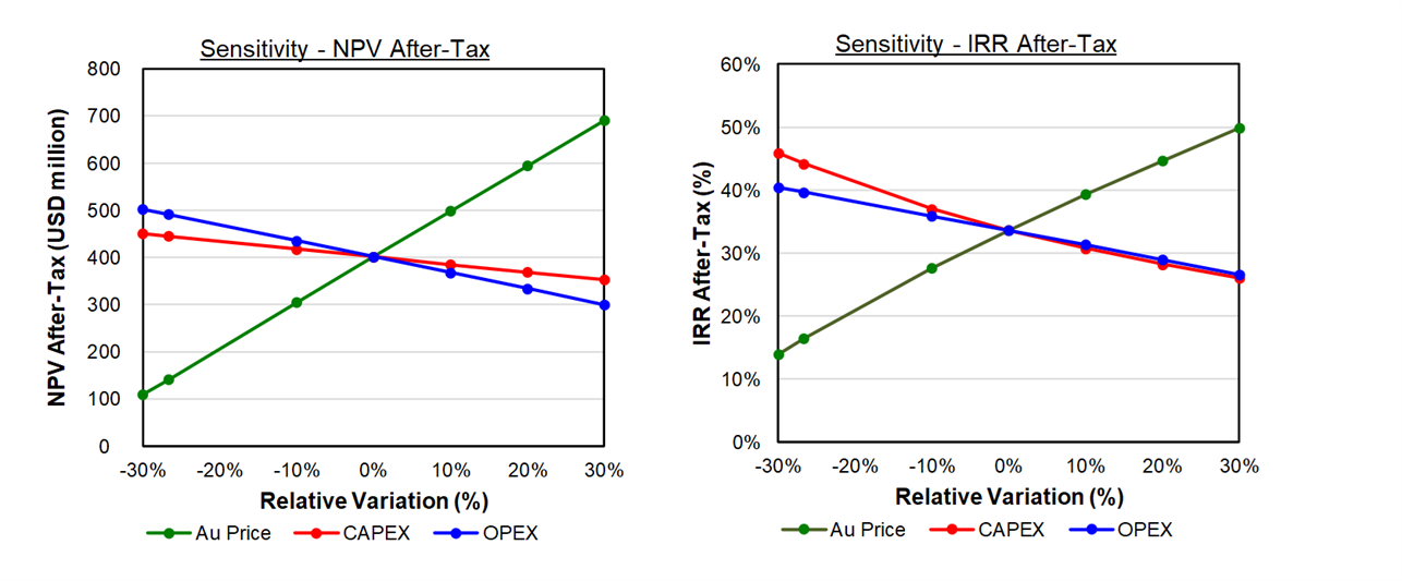 The figures below illustrate the after-tax sensitivity analysis of the NPV5% to various key operating parameters and the gold price.