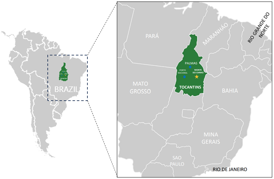 The Monte do Carmo Gold Project is located in the state of Tocantins, Brazil; 2 km east of the town of Monte do Carmo, 40 km from Porto Nacional and 100 km from Palmas, the capital of Tocantins state. The Serra Alta deposit has been the main focus of exploration and development at the Monte do Carmo Project. Cerrado has conducted preliminary drilling on several analogue satellite deposits however the Company has been mostly focused on infill drilling at Serra Alta to support the Feasibility Study. The Project benefits from convenient access to essential infrastructure including paved roads, energy, 69 kV electrical power line, water supply, and an international airport, and is well supported by the local community.