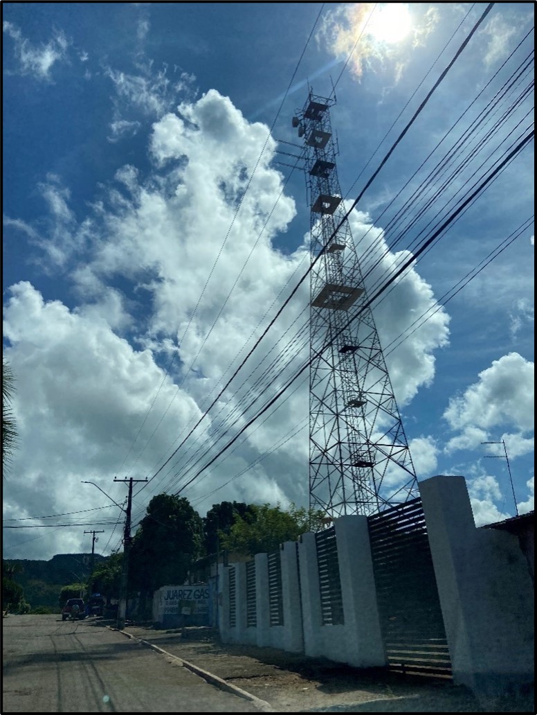 Telecommunication mast in Monte do Carmo town. There is cellular reception in the immediate area, including the camp.