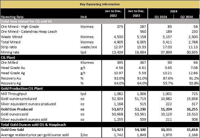 Operational results presented for Q2 2024 showed a marked improvement over the previous quarter as the full exploitation of the Calandrias Norte high-grade open pit was achieved in addition to the continued ramp up of the heap leach operations. Production results for June saw a modest decline due to harsh weather conditions which saw the closure of most roads in Santa Cruz and the closure of Comodoro Rivadavia airport for several days. Heavy snow impacted the transportation of high-grade ore to the mill and reduced mill throughput. That said, this material is expected to be processed in the coming months, supporting production levels going forward. The performance of the Heap leach during this period continues to improve despite the harsh weather and bodes well for the ramp-up to full commercial production, which we expect to occur in Q3/2024 as the weather improves. Performance of the crushing circuit at the Calandrias Sur Heap Leach Project continues to improve, allowing the placement of more ore on the heap leach pad during the quarter, which is key to delivering higher sustained production rates. Recovery rates are in line with expectations given ore on the pad to date. Production from the Heap Leach improved from 491 GEO in April to 985 GEO in May. It maintained close to these levels in June at 943 GEO despite extremely wet and cold conditions that affected leaching kinetics. Additional crushing capacity is being added via the addition of a mobile crushing unit that has recently been delivered to the site and is set to double overall crushing capacity at Calandrias Sur to around 10,000 tpd to support an increase in production in the latter part of the year doubling capacity to around 4,500 ounces per month.