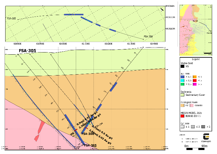 Drill Hole FSA-306 targeted the recently discovered E3 zone. Mineralization in E3 relates to the occurrence of a granitic porphyry dyke with a general West/Northwest direction, that provides a permissive host rock and fluid conduits to upper stratigraphic levels. Holes have been drilled in different directions to better constrain the geometry and extent of the dyke. The best intercept in E3 reported today is from hole FSA-305 that crosses 3m (apparent width) at 2.14 g/t. E3 remains open both along strike and down dip.