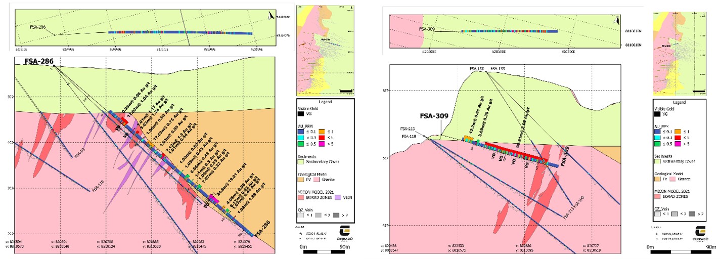 Hole FSA-309 is also outstanding. Shallow dipping drilling targeted the granite in proximity to the volcanic intrusive contact intercepting 91m at 2.09g/t Au from 66m, including 7m at 19.09 g/t Au from 110m. Results confirm the significance of the contact zone in terms of extending the continuity and lateral extent of the mineralization and consolidate a well-endowed area on the northern edge of the east zone.