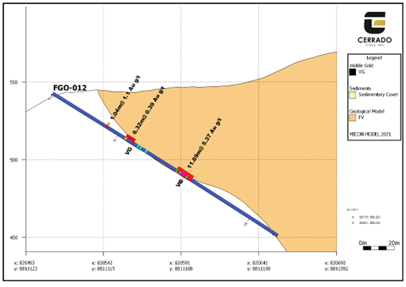Hole FGO-012 was collared between holes FGO-01 (discovery hole) and FGO-04 (described above) intercepting 11.7m at 5.37 g/t Au from 93.6m, including 3.1m at 13.78 g/t Au from 97.0m.