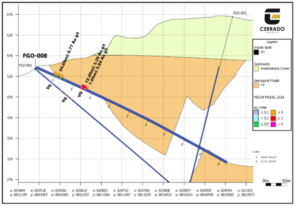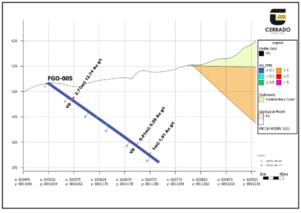 Hole FGO-005 returned 2.7m at 12.74 g/t Au from 57.9m on a shear vein, this intercept, located approximately 30m north along strike of the one described in hole FGO-004 defines the current north edge of the mineralized corridor.