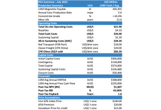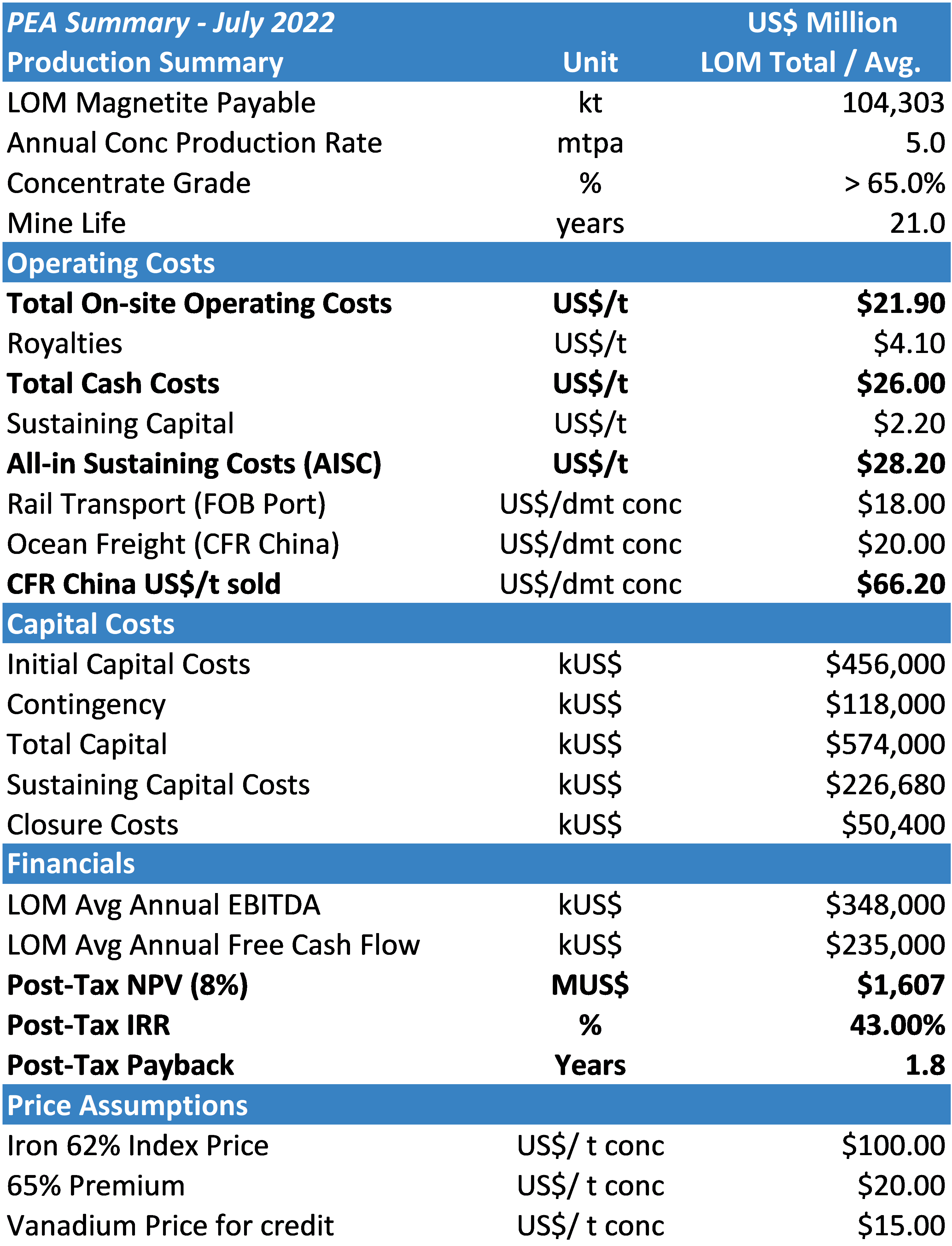 The Bankable Feasibility Study will look to provide greater detail into the potential of the project that was highlighted in the previous 2022 NI 43-101 Preliminary Economic Assessment ("PEA") that delivered a project NPV8% of US$1.6 Billion. With a higher quality, 67%+ iron concentrate product now expected, we anticipate any cost inflation to be largely offset by premium pricing. The PEA outlined a project producing 5.0 million tonnes of high-grade iron concentrates per annum (equivalent to producing 300,000 Au ounces per year at long term consensus prices) over a 21-year mine life. This material would then be rail hauled on existing railways to the Port of Saguenay for export to global markets. Given the scale of the existing resource, future expansion remains a likely possibility. The table below provides the summary of the PEA results.
