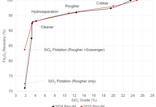 These processing steps led to the production of a concentrate grading 67% iron 1.8% silica for an economic magnetic iron recovery of +72%. The addition of a scavenger flotation circuit further improved the global economic magnetic iron recovery to +83% (+68% total iron), representing a significant enhancement compared to the initial results, as shown in the table below: