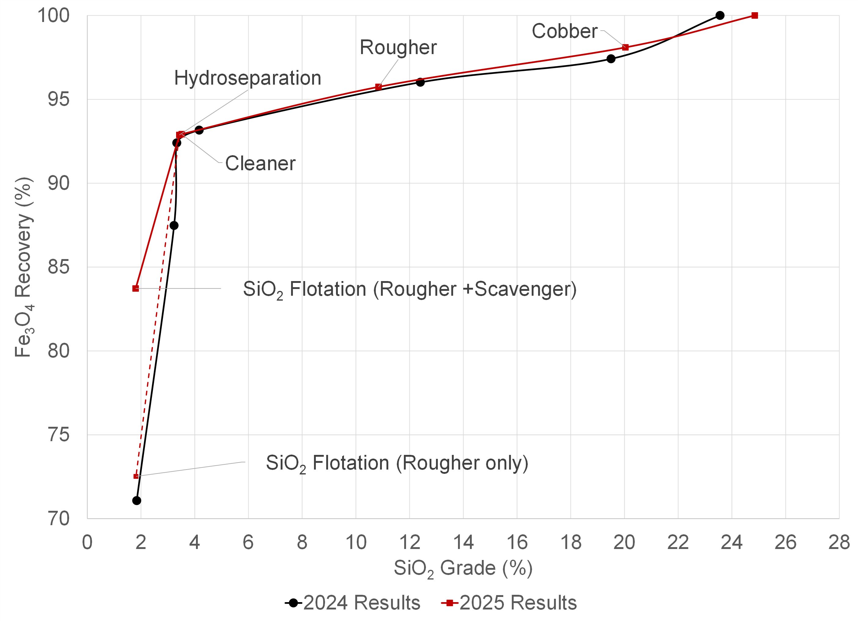 The magnetic concentrate was then processed through a reverse iron flotation stage to produce a low-silica concentrate.