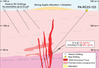 - PA_RC23-123: 12m @ 122.2 g/t Au from 109m; including: