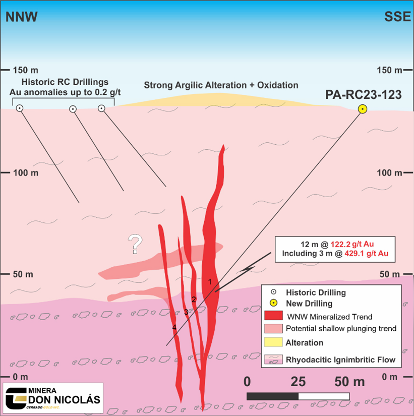 TORONTO, ON, September 11, 2023 (Newswire.com) - (TSX.V:CERT)(OTCQX:CRDOF) ("Cerrado" or the "Company") is pleased to announce the highest grade intercept ever reported at its Minera Don Nicolas operation in Santa Cruz, Argentina ("MDN"). RC Hole PA_RC23-123 intercepted outstanding results from 109m of 12m (apparent width) at 122.2 g/t gold, including 3m at 429.1 g/t from 109m. This intercept ranks within the top best metal content (linear grade: m* Au g/t) in MDN's all-time exploration drilling results. Additionally, 3 other relevant intercepts at 126m (2m at 2.9 g/t Au), 132m (1m at 2.4 g/t Au) and 142m (2m at 4.2 g/t Au) are interpreted as high grade cores along parallel structures.