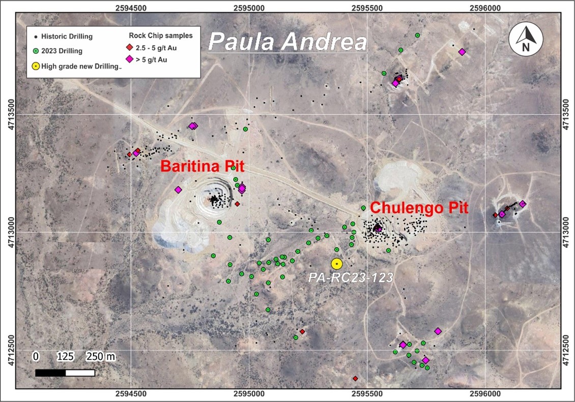 Hole PA_RC23-123 (Figures 1. and 2.) was collared approximately 150m to the west of MDN's operating high grade Chulengo pit. The hole was collared to target the extension of Chulengo's first order controlling structure. This West/Southwest trend can be traced on surface following intense hydrothermal alteration along a strike length of over 650m. The Chulengo high grade pit is located on the eastern edge of the trend, and the Baritina high grade pit sits 200m north of the western edge of the trend. The Company is immediately following up with additional holes in the area.