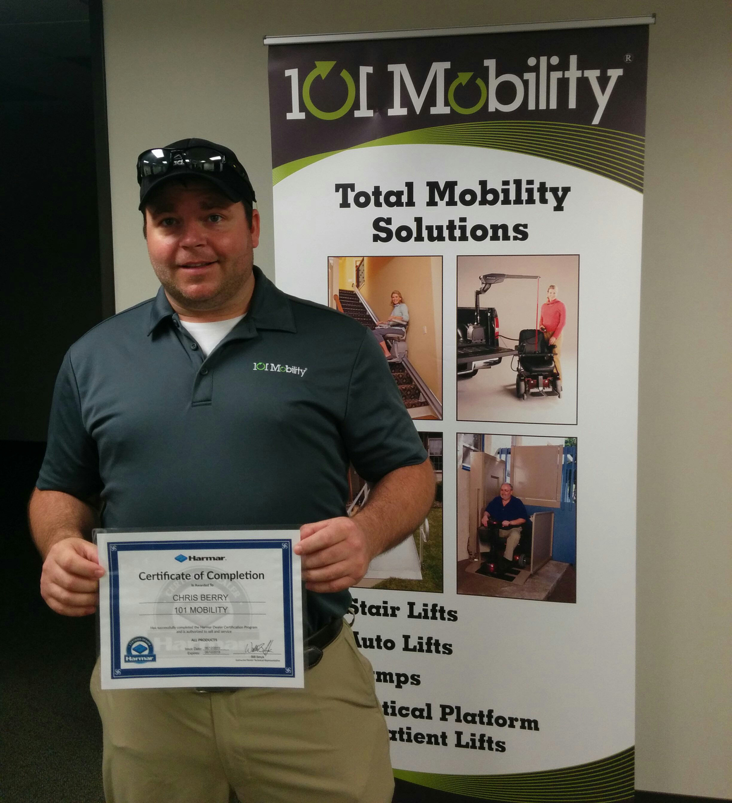 Seizing this opportunity, Chris Berry, Installer/Service Technician with 101 Mobility of Oakland County, achieved certifications from both Harmar and Bruno, industry-leading manufacturers of mobility products such as stairlifts and auto lifts.