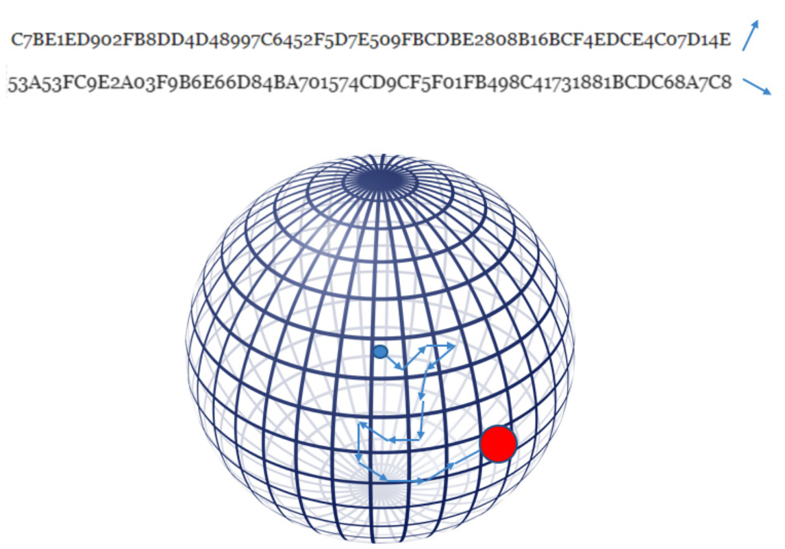 3. Each node is also given a “trusted code” hormone which allows the node to input one vector. The hormone is hashing the vector input with the ledger information and hormone ID contained in the block, forming a hash which is again translated into a vector. (All vectors are adjusted to the same length.) So, it is next to impossible to predict the direction of the vector based upon the input. The addition of all submitted vectors (of a minimum number of submitted vectors) gives a start and endpoint of a directional vector.