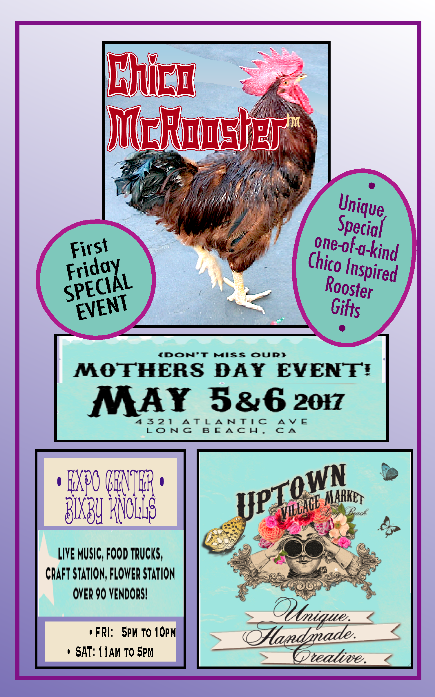 Paramount, California, May 4, 2017 (Newswire.com) - Chico McRooster is so happy to be part of this yearly Mother’s Day event at the Long Beach Bixby Knolls EXPO Center. This month only, First Friday is held over through Saturday to allow extra shopping time for Mother’s Day — only one week away. Hours are Friday, 5 p.m. to 10 p.m., and Saturday, 11 a.m. to 5 p.m.