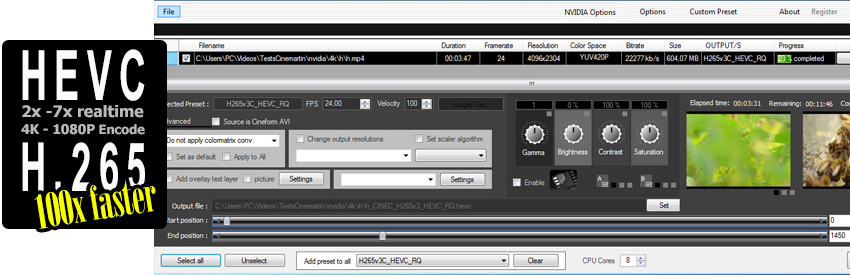 NVIDIA GForce and QUADRO users will be able to convert videos to last generation HEVC H.265 codec at world fastest speeds*, just convert a 7 minutes FullHD video to HEVC in only 1 minute, or convert 1 minute of 4K to H.265 in just 30 seconds.