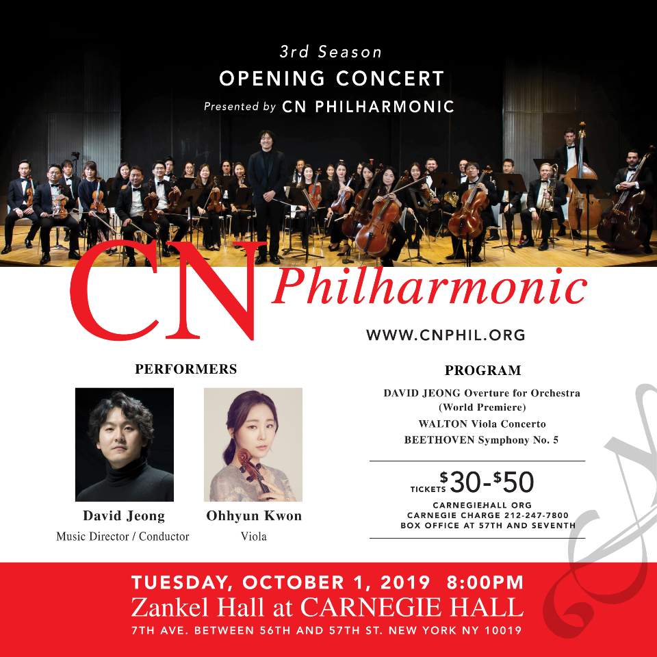 CN Philharmonic’s mission is to breathe new musical inspirations into an emotionally engaging art form by showcasing classical music’s diverse traditional and modern compositions and, as well, founder David Jeong’s compositions. Both concerts will present this founder-conductor-composer’s world premiere of his dynamic Overture for Orchestra, Walton’s Viola Concerto with violist Ohhyun Kwon, and Beethoven’s Symphony No. 5. Jeong says his overture is symbolically festive: “To herald a lively new season for musicians and audiences to welcome new beginnings.”