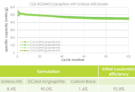Recent tests conducted by multiple parties show that the combination of the CLB’s M Series SiCAM anode material coupled with the Ashland SoterasTMMSi binder exhibits superior (2X+) anode capacity and stable cycle life performance compared to other competing silicon anode materials. According to Dr. Alan E. Goliaszewski, Research and Development Director, Performance Additives at Ashland, “We have seen that the CLB silicon carbon M Series anode material coupled with the Ashland Soteras MSi binder produces an outstanding anode electrode material package with over 90% first cycle efficiency, lower swelling, better charge rates and extended stable cycle life. Used appropriately, it can increase battery energy density by up to 30%.”