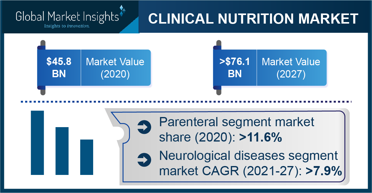 SELBYVILLE, Del., July 19, 2021 (Newswire.com) - According to the latest report, "Clinical Nutrition Market by Product (Infant Nutrition, Enteral Nutrition, Parenteral Nutrition), Consumer (Pediatric, Adult), Application (Cancer, Metabolic Disorders, Neurological Diseases, Gastrointestinal Disorders), Distribution Channel (Retail Stores, Pharmacies & Drug Stores, Online Channels), Regional Outlook, Price Trends, Competitive Market Share & Forecast 2027", by Global Market Insights Inc., the market valuation of clinical nutrition will cross $76.1 billion by 2027.