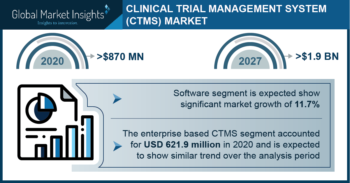 SELBYVILLE, Del., June 7, 2021 (Newswire.com) - According to the latest report, "Clinical Trial Management System (CTMS) Market by Component (Software, Services), Product (Enterprise-based, Site-based), Delivery Mode (Web, Cloud, On Premise), End-use (Pharmaceutical & Biopharmaceutical Companies, Clinical Research Organizations), Regional Outlook, Price Trends, Competitive Market Share & Forecast 2027", by Global Market Insights Inc., the market valuation of clinical trial management system (CTMS) will cross $1.9 billion by 2027.