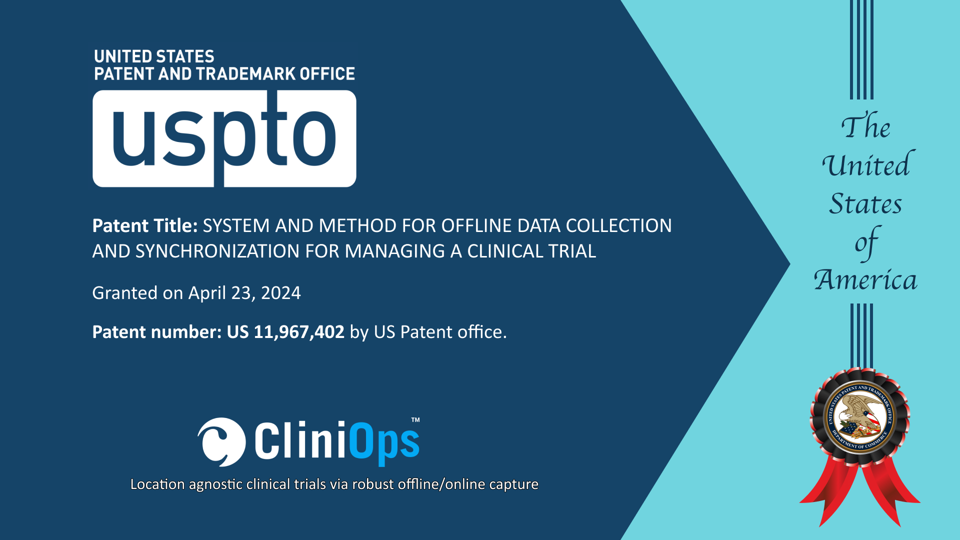 FREMONT, Calif., April 25, 2024 (Newswire.com) - CliniOps, Inc., an innovative technology and data science company for the life science industry, has once again demonstrated its capability to innovate and respond to unmet needs in CTs, particularly, the challenge of managing data collection in remote and disparate regions across Africa and LMIC countries. The U.S. Patent and Trademark Office (USPTO) awarded CliniOps the U.S. Patent No. 11,967,402 on April 23, 2024, titled “System and Method for Offline Data Collection and Synchronization for Managing a Clinical Trial.” Avik Kumar Pal, CEO, and Yerramalli Subramaniam, CTO, are listed as patent inventors.