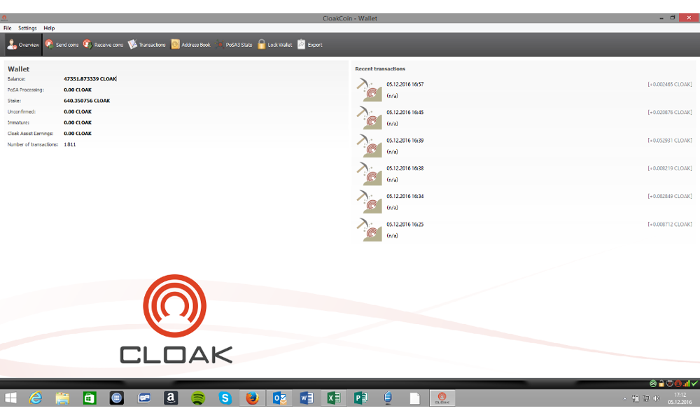 Best of all, where many other coins offer command line interface wallets which are hard to handle by the average user, CLOAKCOIN offers GUI based wallets for all major platforms which are easy to install and easy to run as you can see in this Windows Wallet v1.9.7.56 screenshot.