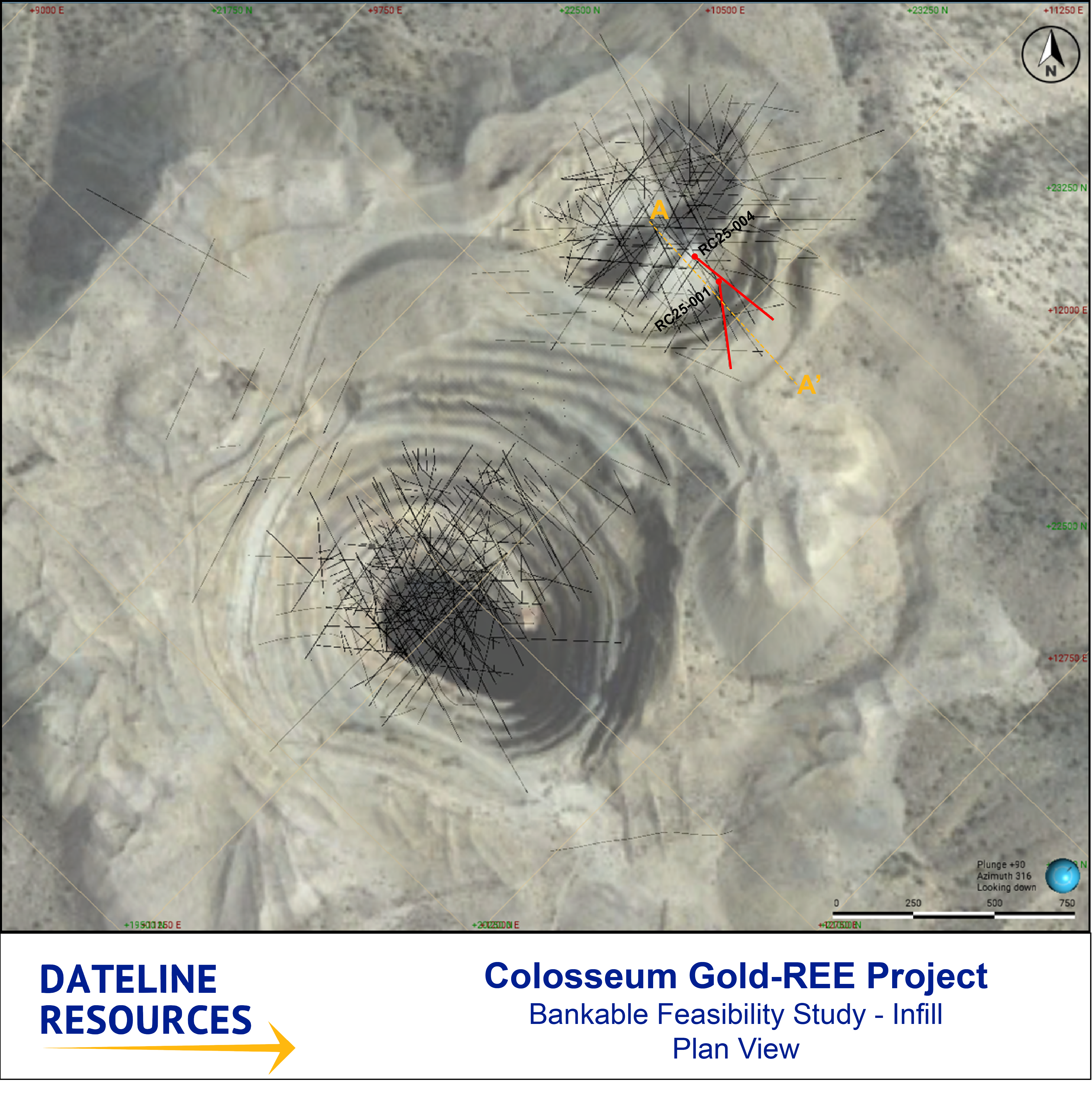 SAN BERNARDINO, Calif., December 3, 2025 (Newswire.com) - Dateline Resources Limited (ASX:DTR)(OTCQB:DTREF)(FSE:YE1) is pleased to announce further drilling results at its 100%-owned Colosseum Gold and Rare Earth Element (REE) Project in San Bernardino County, California. The results from a further two reverse circulation (RC) holes drilled below the North Pit have provided gold assay results that exceed the mineral resource grade for the Indicated blocks that they intercepted, with the expectation that this result will improve the mineral resource grade for the blocks in the vicinity when a new mineral resource estimate is undertaken early in 2026.