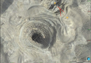 Figure 2: Cross-section of the Colosseum deposit illustrating the existing open pit outline and gold intercepts