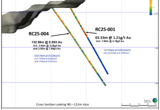 RC25-004 had a broad intercept of 132.58m @ 0.95g/t Aufrom 3.05m. incl 3.05m @ 3.25g/t Aufrom 27.43m and 3.05m @ 7.09g/t Aufrom 112.8m).
