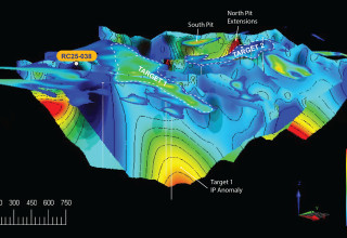At Target 2, the holes are designed to test the buried body of rock identified by the gravity and electrical surveys on the eastern side of the claim, a zone that has never previously been drilled.