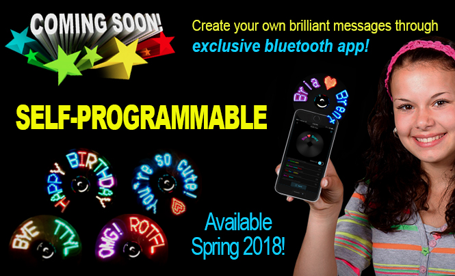 SELF-PROGRAMMABLE Selfie Fan which allows the user to download an app, and then through proprietary technology, and a wireless Bluetooth connection, customize, program and send their very own illuminated LED messages to the fan blades, over & over again!”