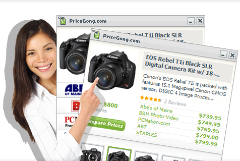 While shopping online, PriceGong identifies the exact product you are searching for and inserts a small separate browser window (known as a slider) in the bottom-right-hand corner of the users' existing browser. Using an extensive network, PriceGong scans thousands of online stores and compares prices to find the best online deals for the products that the user is searching for, and displays them in the PriceGong slider window. For every product searched, PriceGong will display alternative deals plus additional information regarding the products and retailers, enabling the user to make the best, most informed shopping decisions.