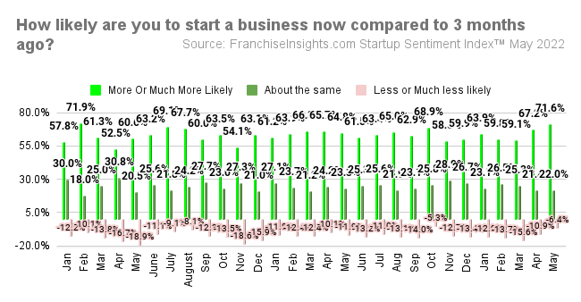 NORFOLK, Va., June 1, 2022 (Newswire.com) - While measures of consumer sentiment have been declining recently, optimism about starting a business remains solid. Despite war headlines, stock market declines and inflation woes, 78% of aspiring business owners surveyed in May were resolute about starting their businesses within the coming six months. Not surprisingly, 76.6% of these survey respondents see business conditions about the same or getting better in the next three months. Currently, 67.4% of would-be entrepreneurs agree or strongly agree that "now is a good time to start a business," according to the Small Business Startup Sentiment Index™ by FranchiseInsights.com.