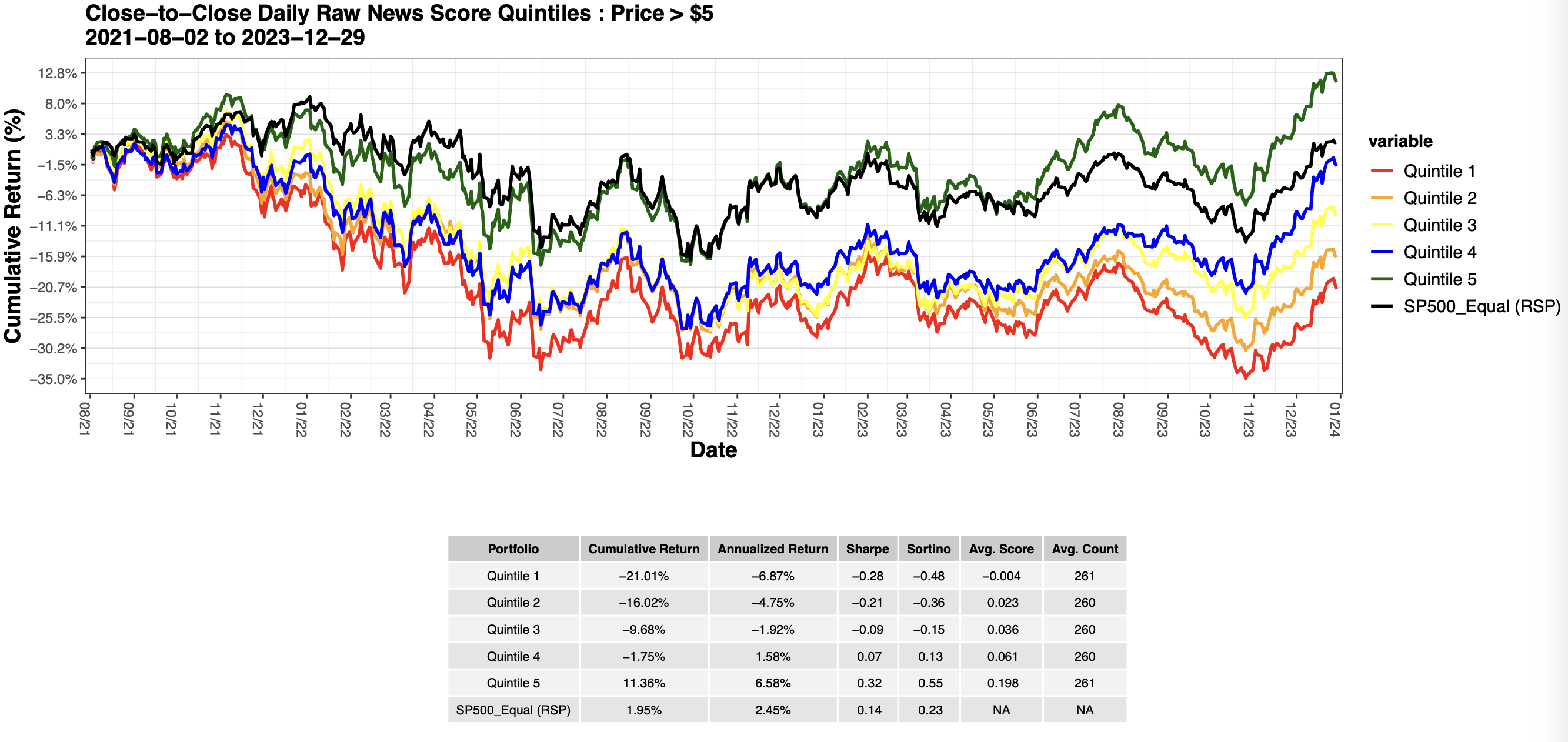 The Quantitative News Feed provides extensive coverage. In real-time, we ingest articles from over 3,000 news sources, covering more than 4,000 unique companies. With our proprietary natural language processing (NLP) technology, we analyze and score news articles at the individual article level, producing sentiment metrics that are usable in trading decisions. Importantly, these metrics are independent of sentiment data from social media platforms, offering a unique perspective on market sentiment.
