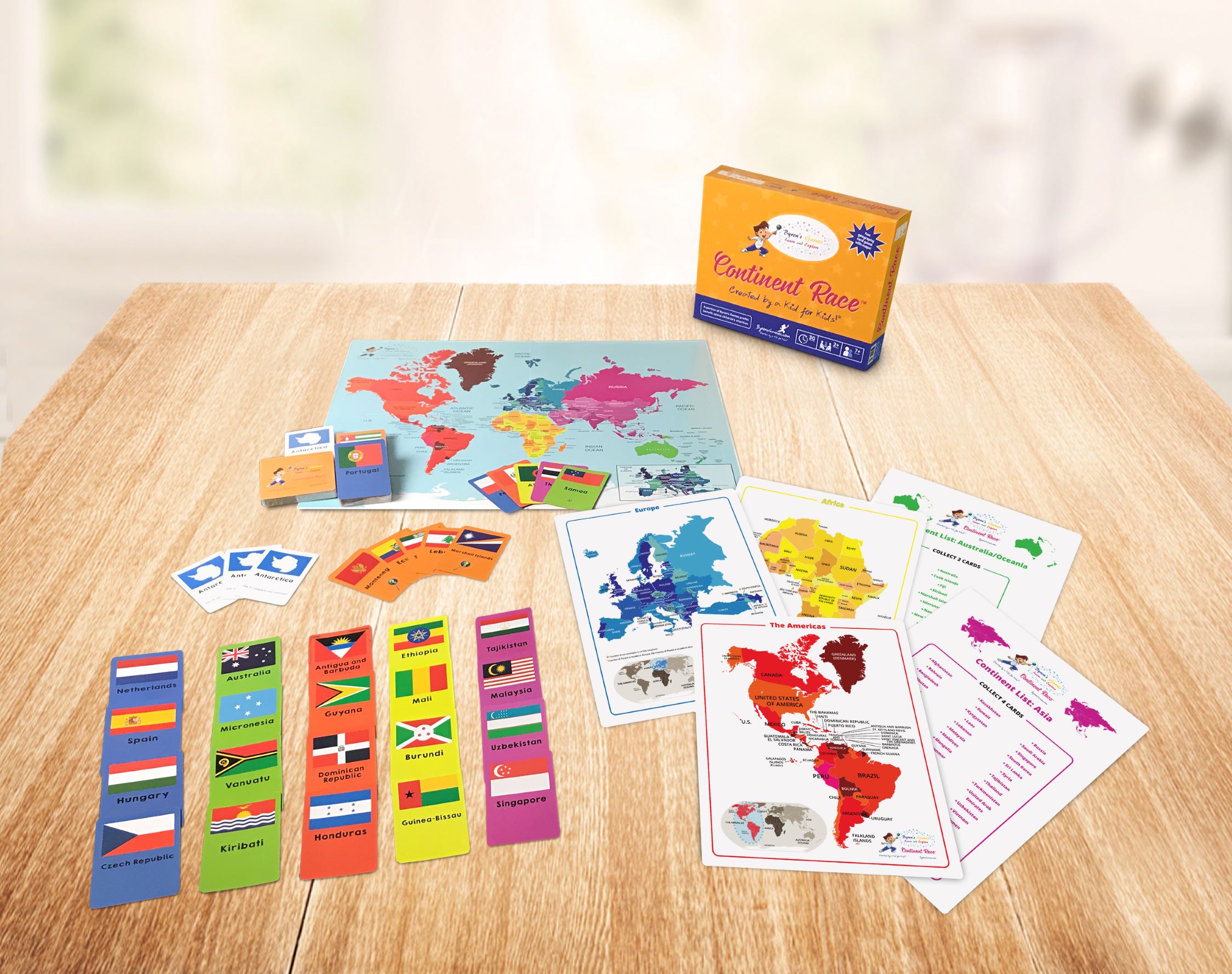 Continent Race also fosters social interaction skills and boosts self-confidence. The object of the game is to be the player who collects the most country flag cards from each continent first. Specialty cards and color-coded maps add to the excitement.