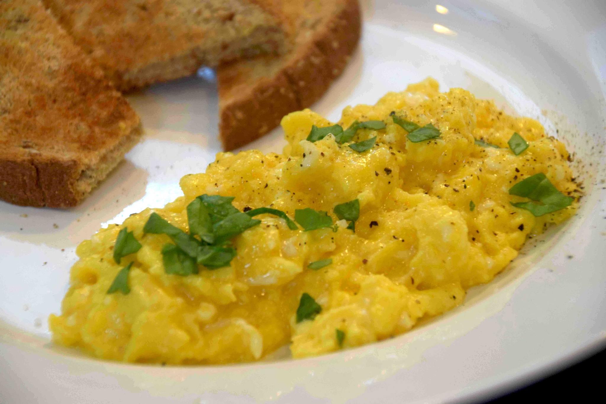 With 30 to 40 seconds of an intermittent slow fold, remove the eggs from the pan onto your warmed plates with toast off to the side. As I like my toast firm and crunchy, with a toasted texture upon the bite.