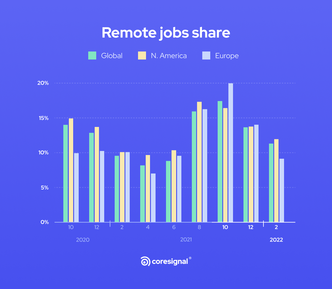 With a 72.5% share of remote job postings published on the platform during the research period, N. America is a clear leader in offering remote job positions. While Europe, analyzing the data during the same period, takes up only 16% share of remote job postings.