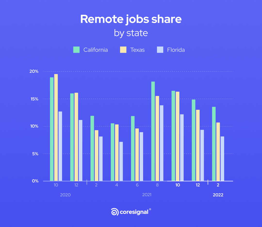California, Texas, and Florida not only are the largest states by population, but they are also some of the primary states for tech hubs. It is a widespread opinion that remote jobs are most common among tech companies, as the job specifics allow employees to change their work location easily. And if the early suggestions in the media that the COVID-19 pandemic might change the work market permanently seemed quite possible, the remote job posts' data shows that it may not be the case.
