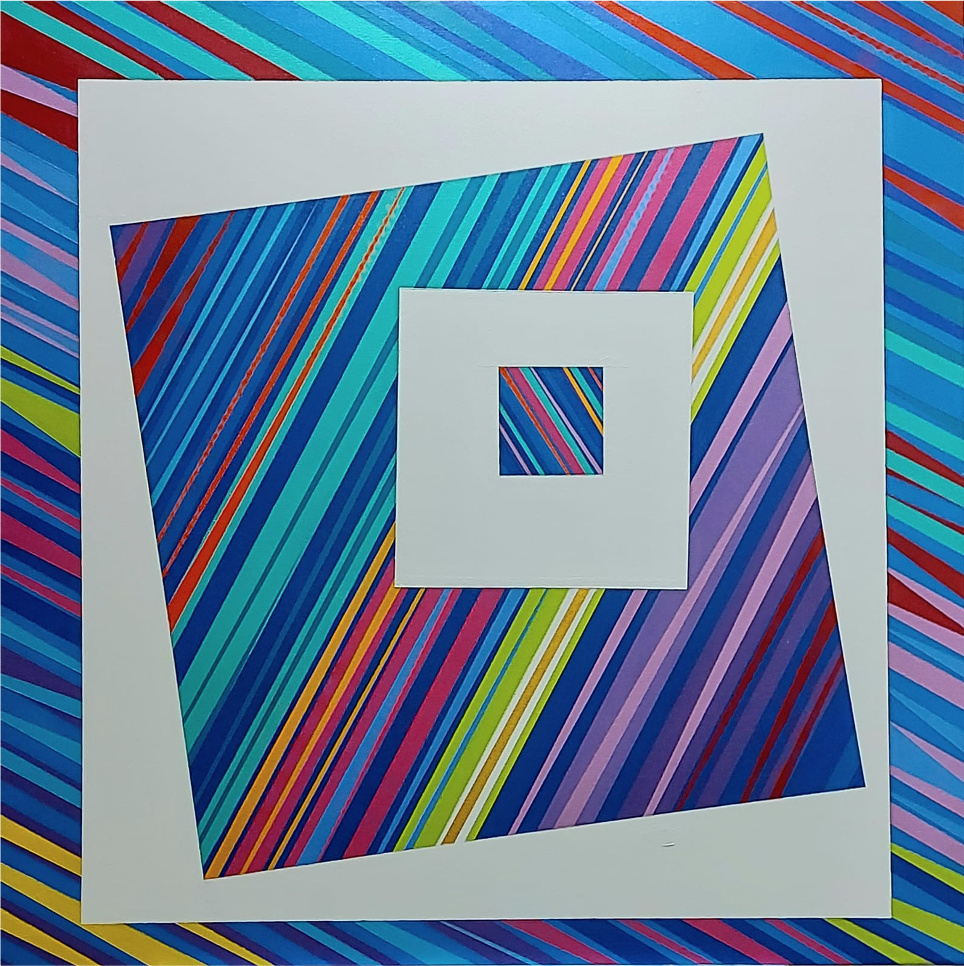 Murillo’s architectural background is evident in his methodical approach to composition and spatial design. Primarily working in acrylic, he creates paintings of geometric, colourful shapes that blur the boundaries between two-dimensional and three-dimensional forms, encouraging contemplation from various angles. His use of structure and pattern generates dynamic energy and movement on the canvas, drawing you in and creating the sensation of gazing into an optical illusion.