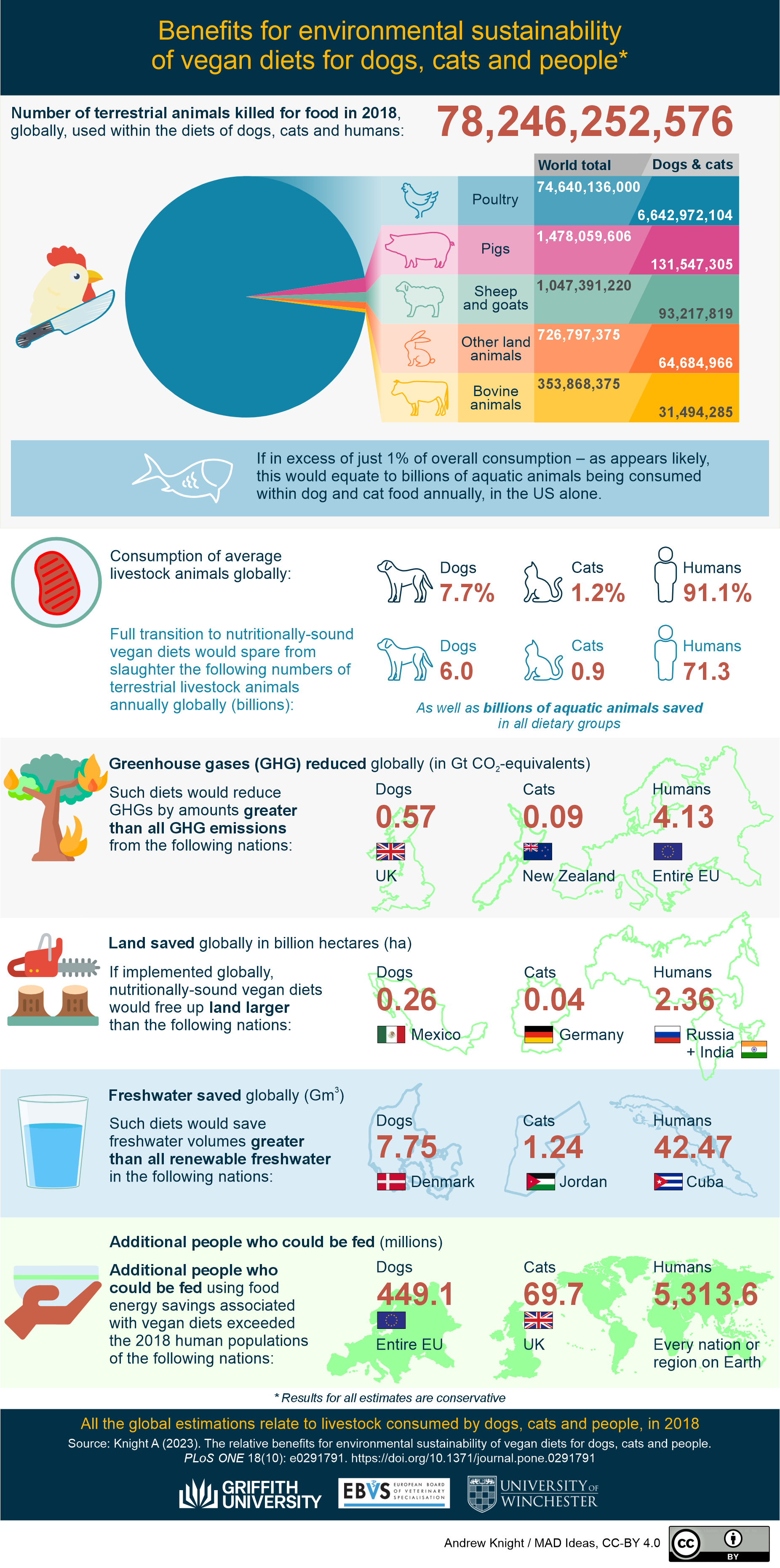 WINCHESTER, England, October 4, 2023 (Newswire.com) - Studies show plant-based diets lower greenhouse gas emissions (GHGs), and use less land and water. Food energy savings mean more people can be fed. This has triggered calls for vegan diets – but not for our pets. Yet a new major study published in leading scientific journal PLOS ONE has demonstrated very large environmental benefits associated with nutritionally-sound vegan diets – for dogs and cats, as well as people.