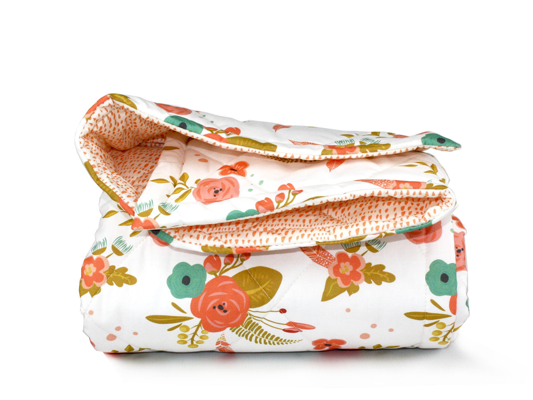 Inspired by nature and spring florals every piece is carefully selected to work in a beautifully coordinated collection or to shine solo. The soft but vivid color palette features delicious peach, mint, pinks, whites and accents of charcoal grey. But what makes this collection especially distinctive is how wonderfully colors, textures and patterns complement and play off each other. Thinking our “IN FULL BLOOM” line is only for baby girls? Not true! Aside from a beautiful floral print that inspired it all, there are also fun and bright ginghams, watercolor stripes, soft cuddly minky solids, tiny all-over droplets, as well as adorable nursery accessories that are gender neutral.