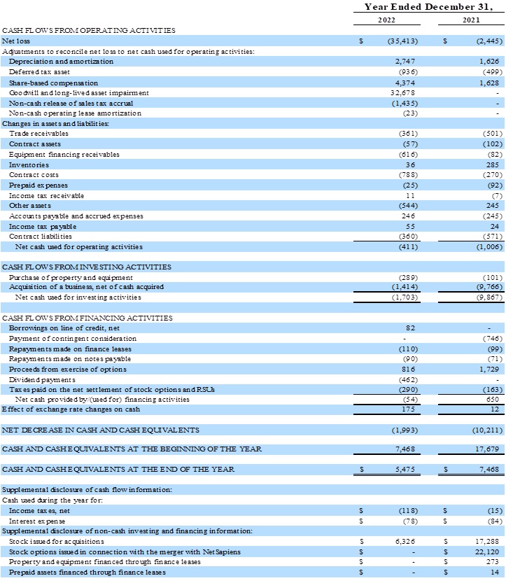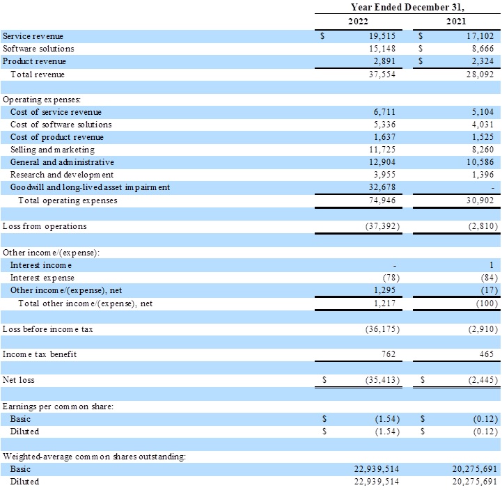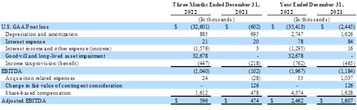The Company reported a net loss of $(35.4) million for the year ended December 31, 2022, or a $(1.54) loss per basic and diluted common share, compared to $(2.4) million net loss, or $(0.12) per basic and diluted common share for the year ended December 31, 2021. During the fourth quarter of 2022, we recorded a goodwill impairment charge of $32.6 million and a $69,000 long-lived asset impairment, which contributed to the $(35.4) million net loss for the year ended December 31, 2022.