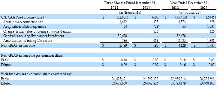 Non-GAAP net income of $4.1 million for the year ended December 31, 2022, or $0.18 per basic common share and $0.16 per diluted common share, compared to a non-GAAP net income of $1.7 million or $0.09 per basic common share and $0.07 per diluted common share for the year ended December 31, 2021.