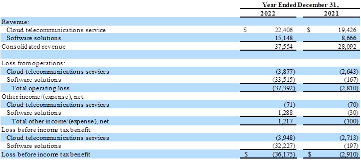 Consolidated software solutions revenue for the year ended December 31, 2022 increased 75%, or $6.5 million to $15.1 million compared to $8.7 million for the year ended December 31, 2021. Software solutions revenue from 2021 represents revenue from the NetSapiens business combination from the acquisition date of June 1, 2021.