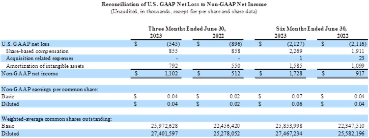 Non-GAAP net income of $1,102 for the second quarter of 2023, or $0.04 per basic and diluted common share, compared to non-GAAP net income of $512 or $0.02 per basic and diluted common share, for the second quarter of 2022.