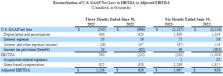 EBITDA loss for the six months ended June 30, 2023 of $(283), compared to a loss of $(1,006) for the six months ended June 30, 2022. Adjusted EBITDA for the six months ended June 30, 2023 of $1,987 compared to $928 for the six months ended June 30, 2022.