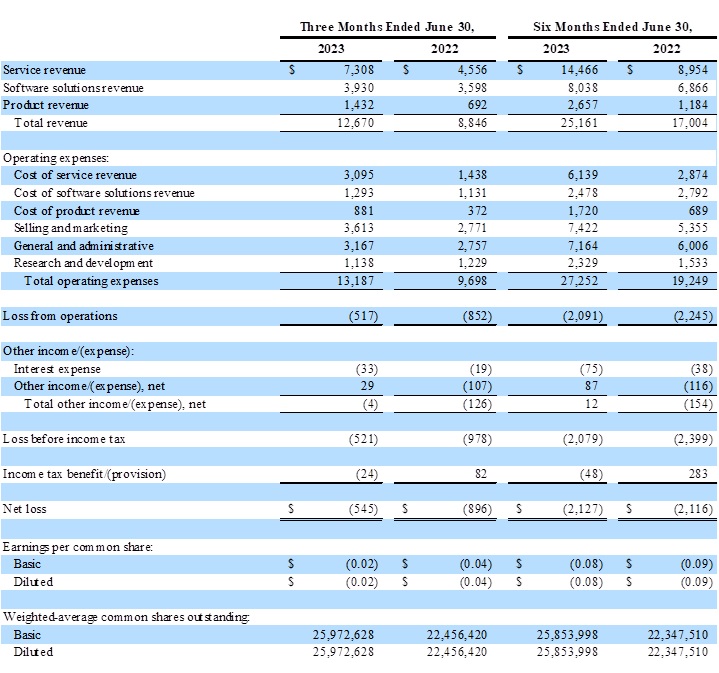 Non-GAAP net income of $1,727 for the six months ended June 30, 2023, or $0.07 per basic common share and $0.06 per diluted common share, compared to non-GAAP net income of $917 or $0.04 per basic and diluted common share for the six months ended June 30, 2022.
