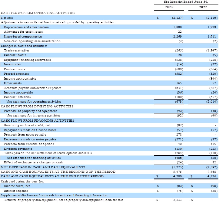 Cash used for operating activities for the six months ended June 30, 2023 was $(673) compared to $(2,614) used for the six months ended June 30, 2022. Cash used for investing activities for the six months ended June 30, 2023 was $(92) compared to $(40) used for the six months ended June 30, 2022. Cash used for financing activities for the six months ended June 30, 2023 was $(486) compared to $(20) used for the six months ended June 30, 2022.