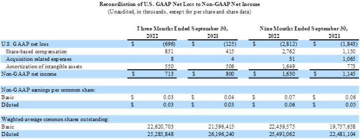 Non-GAAP net income of $713,000 for the third quarter of 2022, or $0.03 per basic and diluted common share, compared to non-GAAP net income of $800,000 or $0.04 per basic common share and $0.03 diluted common share for the third quarter of 2021.