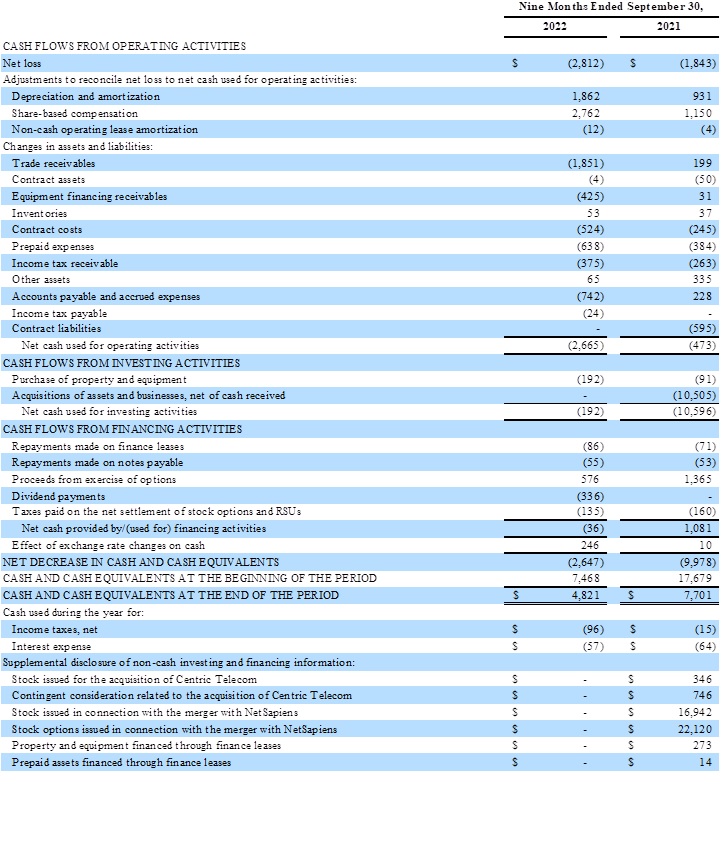 EBITDA loss for the nine months ended September 30, 2022 of $(927,000), compared to a loss of $(1.1) million for the nine months ended September 30, 2021. Adjusted EBITDA for the nine months ended September 30, 2022 of $1.9 million, compared to $1.1 million for the nine months ended September 30, 2021.